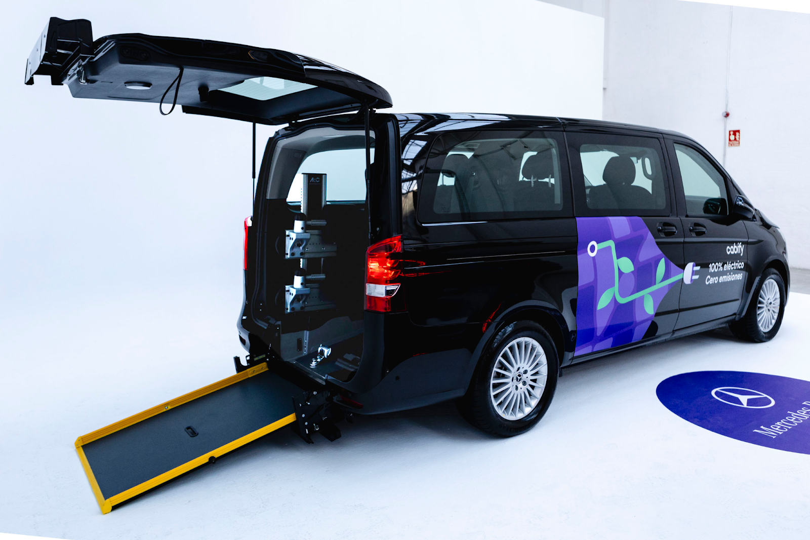 Vehículo Cabify Access con rampa trasera desplegada para acceso en silla de ruedas:
