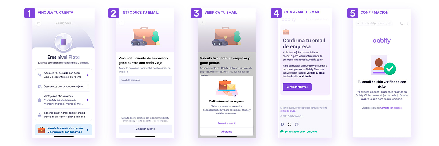 Al pulsar ‘Vincular email’ se mostrará un mensaje de confirmación indicando que tus viajes corporativos ahora suman puntos en tu Cabify Club.